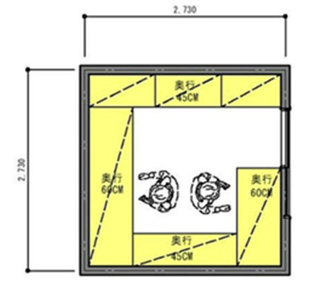 這是一個純粹作為收納空間的衣帽間的布局,面積大約為7.5平米??紤]布置衣櫥(進(jìn)深600mm)和普通收藏柜(進(jìn)深450mm),收藏部分的面積比例大約為52%