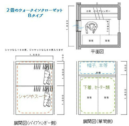 同樣的空間,也可采用一邊掛衣物一邊設(shè)置多屜柜(圖中簞笥的部分)的分類方式。