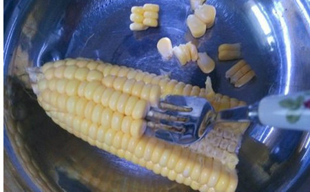 說實(shí)話這東西很危險(xiǎn),用它的時(shí)候刀口得對(duì)著掌心,很容易在大拇指內(nèi)側(cè)向下三分之二處留下長(zhǎng)1cm,寬1mm(具體還看手勁大小)的血口子;這不是蒙古吃羊肉,沒那么多禮數(shù);你不就是想吃個(gè)玉米稀飯么,只需要把玉米從中間掰開,用個(gè)叉子就搞定了;三岔口向外,安全,簡(jiǎn)單,方便,實(shí)用……