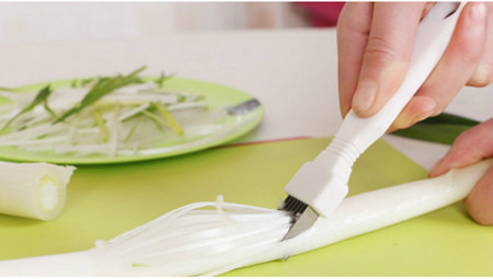 我們來分析下這張圖,蔥、盤子、切蔥器和手,請(qǐng)注意下刀的位置和雙手的力學(xué)把控原理——蔥的中間作為刀起點(diǎn),右手握住切蔥器向左手手指慢慢滑動(dòng),左手抵著桌面捏住蔥,注意力道,不能把蔥捏扁了,不容易切了;記得要用力,這樣才能切的順暢。