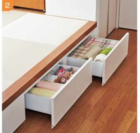 這點(diǎn)已經(jīng)非常普及了。如果家里有日式榻榻米的話不妨嘗試,收納能力非常強(qiáng)。需要注意的是如果設(shè)置抽屜的話,對于榻榻米的結(jié)構(gòu)需要加強(qiáng),否則荷載導(dǎo)致變形的話抽屜會有打不開的風(fēng)險(xiǎn)。