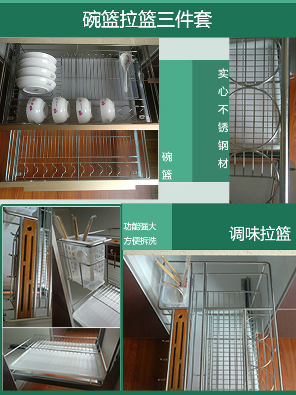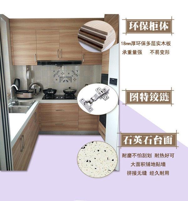 柜體平安樹實(shí)木多層板(桉木芯E0級),臺面石英石(單色),品牌圓管不銹鋼拉籃,碗籃,調(diào)味籃,品牌不銹鋼阻尼鉸鏈,拉手(樣式可自選)三組海蒂詩導(dǎo)軌抽屜。