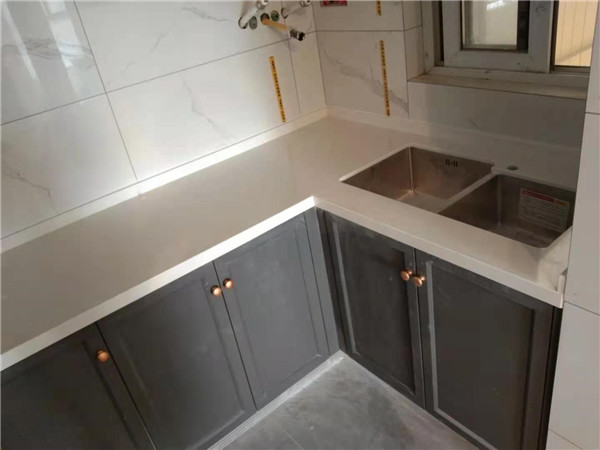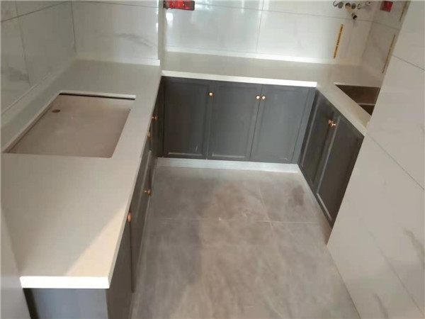 安裝臺(tái)面啦,櫥柜門板選用了深色的,所以臺(tái)面用淺色的石英石來搭配,看著很清爽。