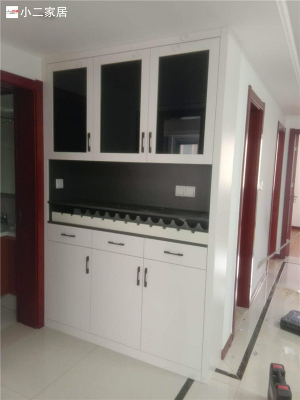 柜子安裝完畢了,深色柜體白色門板,金典、沉穩(wěn)。業(yè)主家餐邊柜上面設(shè)計成玻璃門