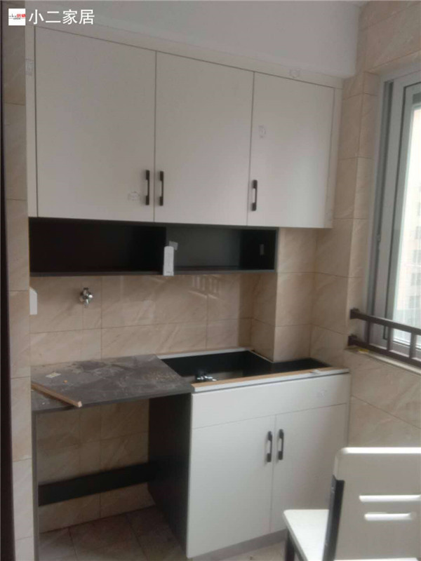 到的廚房水槽、灶具、浴柜臺盆放置在現(xiàn)場,后期臺面安裝需用到。柜子安裝好后進(jìn)入臺面
