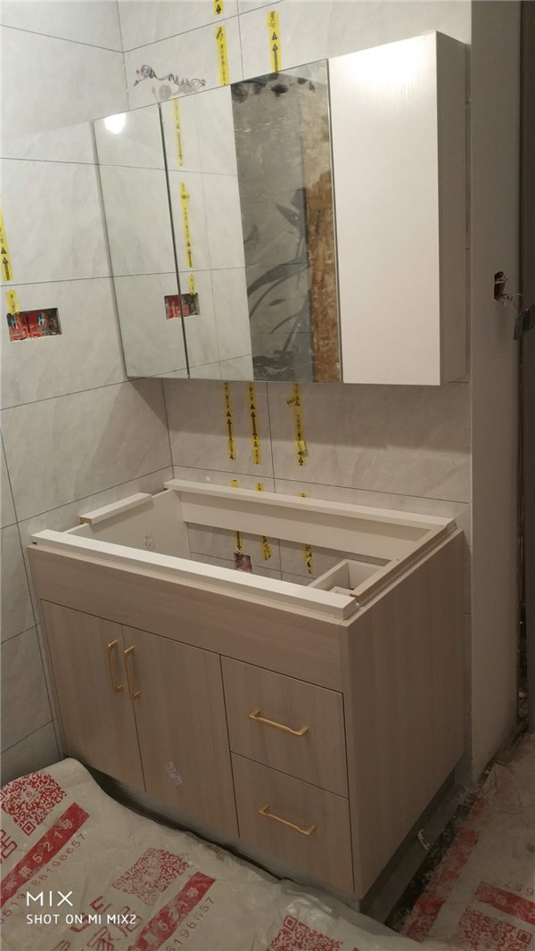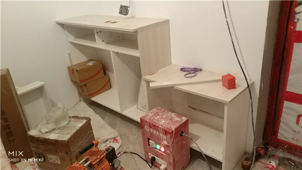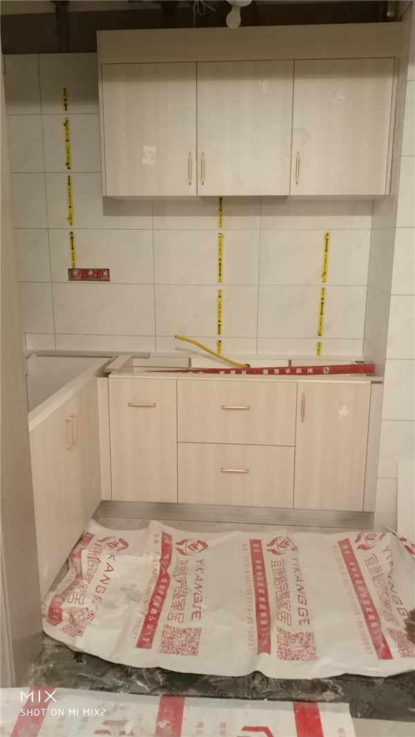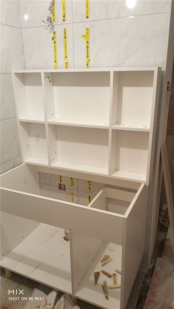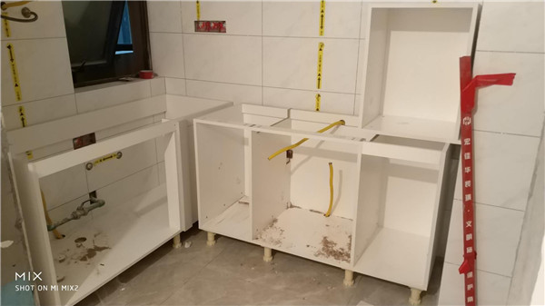 柜體拼裝中,業(yè)主家柜體以淺色調(diào)為主,干凈清爽好打理,天氣炎熱,