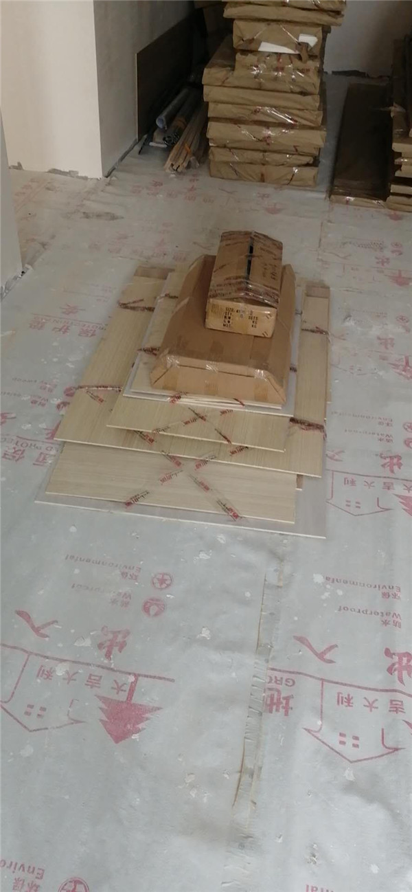 封邊完畢,已進(jìn)入打包環(huán)節(jié)。師傅會(huì)用柏油清洗劑把板全部擦拭一遍,以保證裝到客戶家整潔美觀。