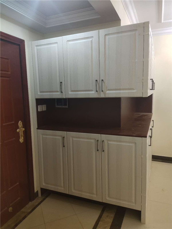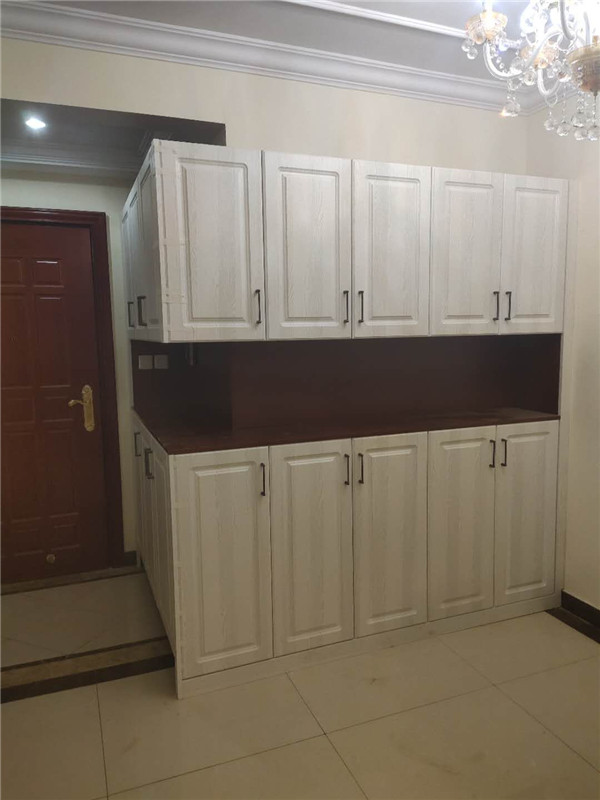 柜子安裝完畢了,因?yàn)榭蛻艏沂蔷b修,頂上有陰角線所以柜子沒有做到頂,最終效果還是可以的