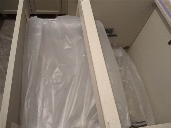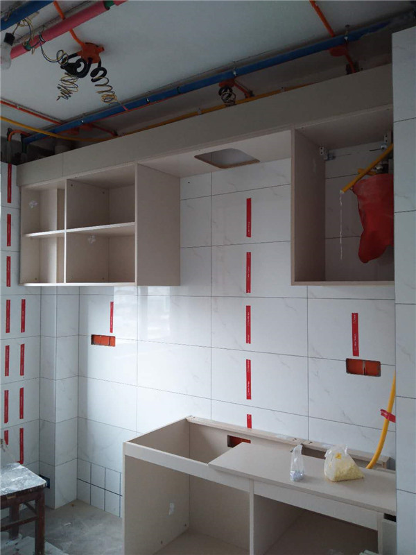 房水槽、灶具、浴柜臺(tái)盆放置在現(xiàn)場(chǎng),后期臺(tái)面安裝需用到。柜子安裝好后進(jìn)入臺(tái)面測(cè)量環(huán)節(jié),臺(tái)面