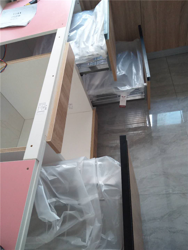 廚房拉籃碗籃調(diào)味料三件套我們標配的諾米銀爵系列的,我們都用塑料膜保護起來了,防止灰塵進入影響導軌的拉伸。