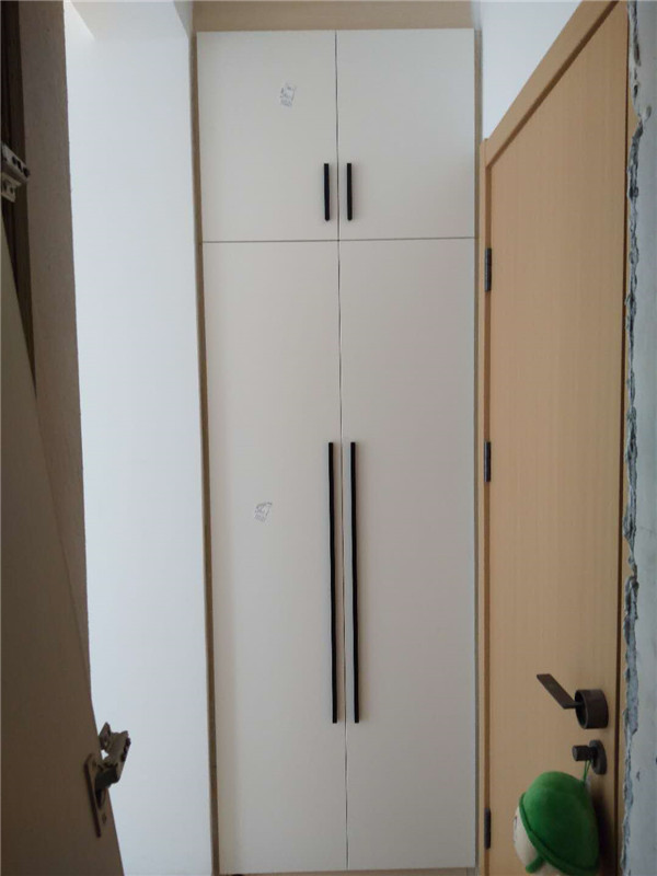 業(yè)主家柜門都用的白色平板門,搭配黑色拉手,鞋柜處做了一個穿鞋的凳子,