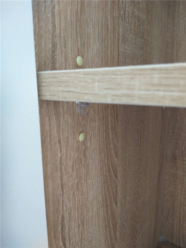 防止潮濕,鉸鏈我們配的是國產(chǎn)一線品牌諾米的,我們會在側(cè)板上多打兩個孔放活動層板并加入孔塞。