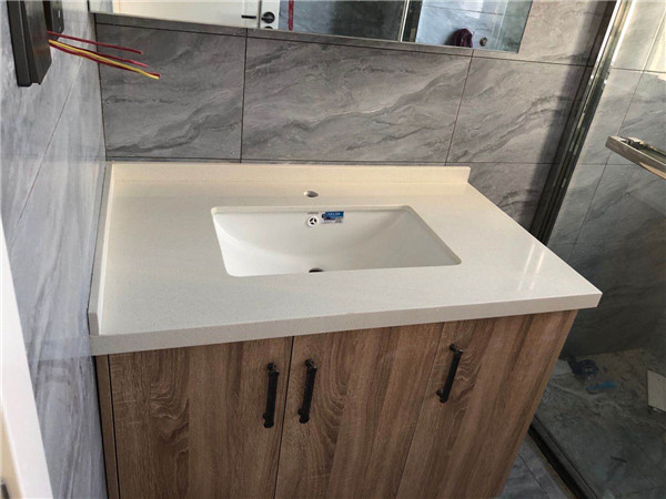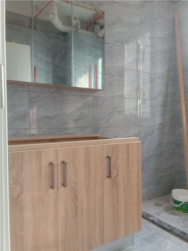 浴柜臺(tái)盆放置在現(xiàn)場(chǎng),后期臺(tái)面安裝需用到。柜子安裝好后進(jìn)入臺(tái)面測(cè)量環(huán)節(jié),