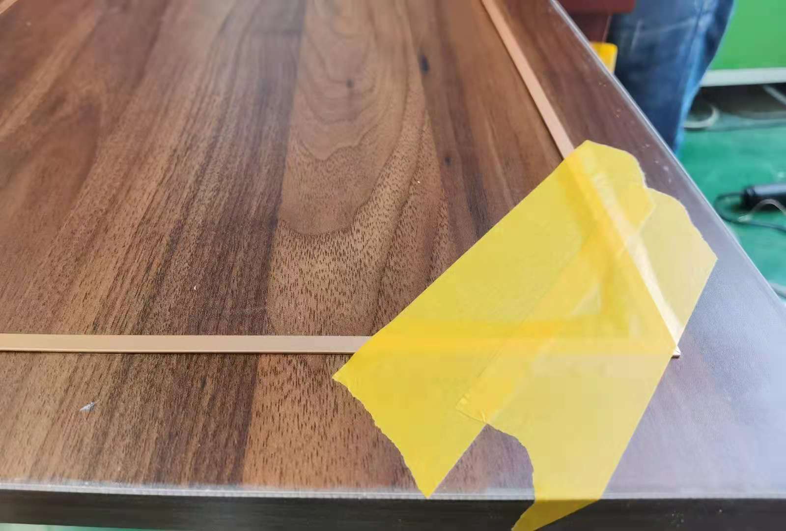 開槽-槽里打膠-金屬條裁剪-鑲嵌好-最后膠帶紙在固定