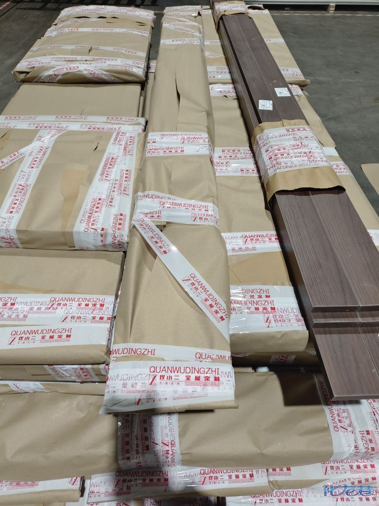 進(jìn)入打包環(huán)節(jié),我家柜子每塊板都是整個(gè)打包起來(lái)的,以防運(yùn)輸過(guò)程中劃傷或者磕碰到,跟板材下面墊板一個(gè)原理哦!重新訂板會(huì)存在色差,這是重點(diǎn),圈起來(lái)必考。全部打包好就可以聯(lián)系客戶送貨咯!