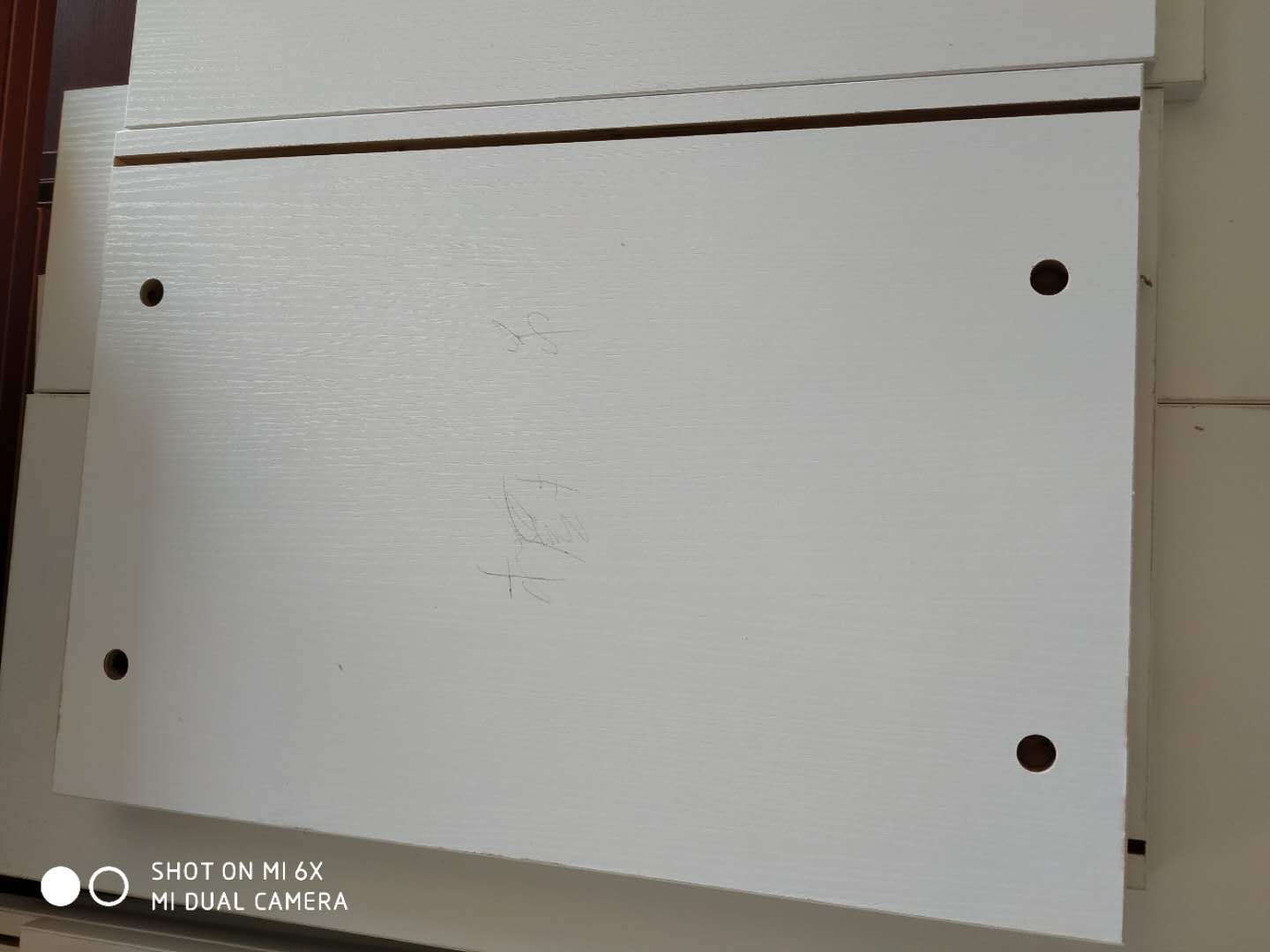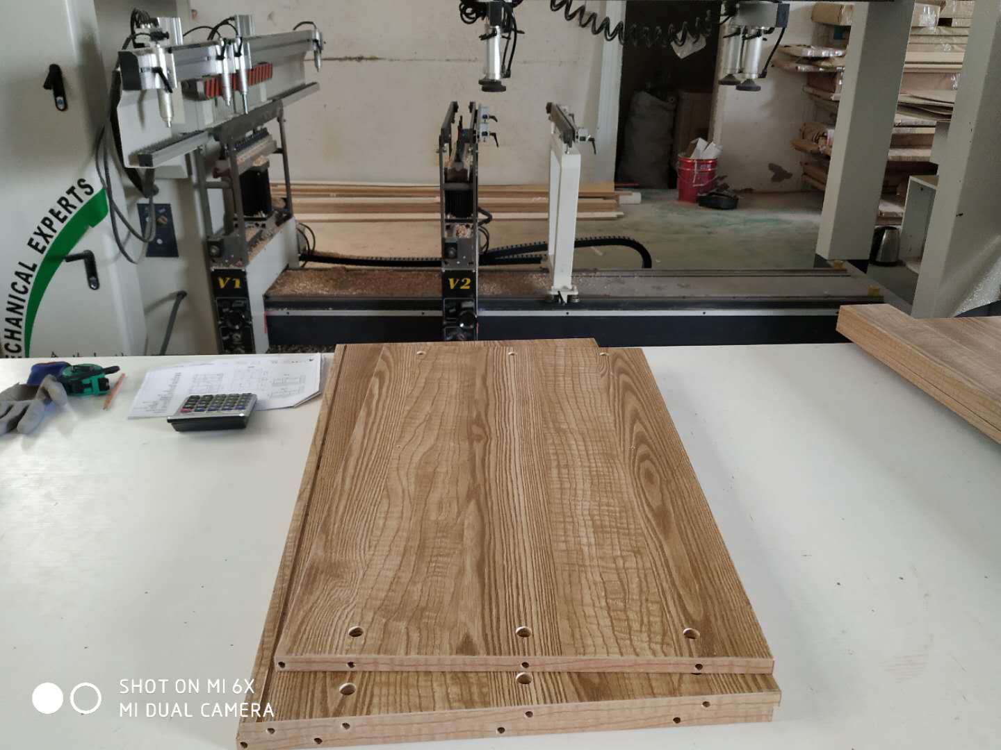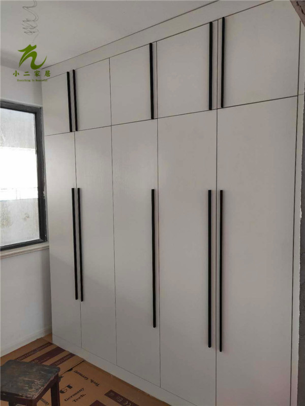 門板封邊準(zhǔn)備打孔,封邊條上印有小二家居的logo!主臥衣柜等打孔中。