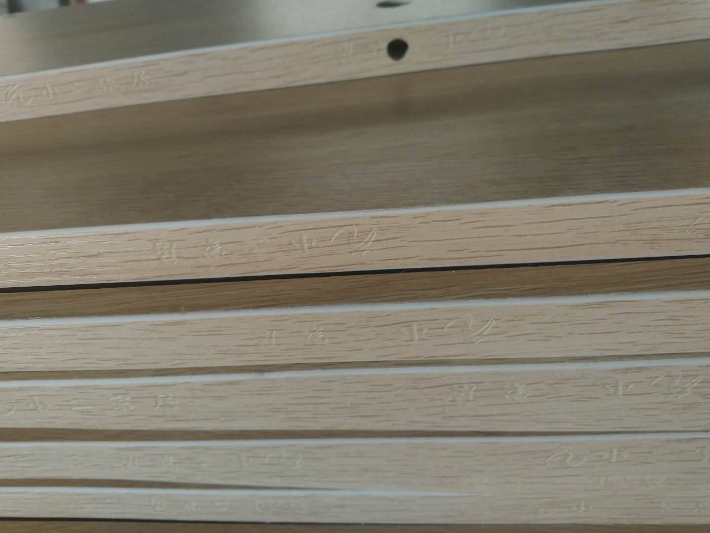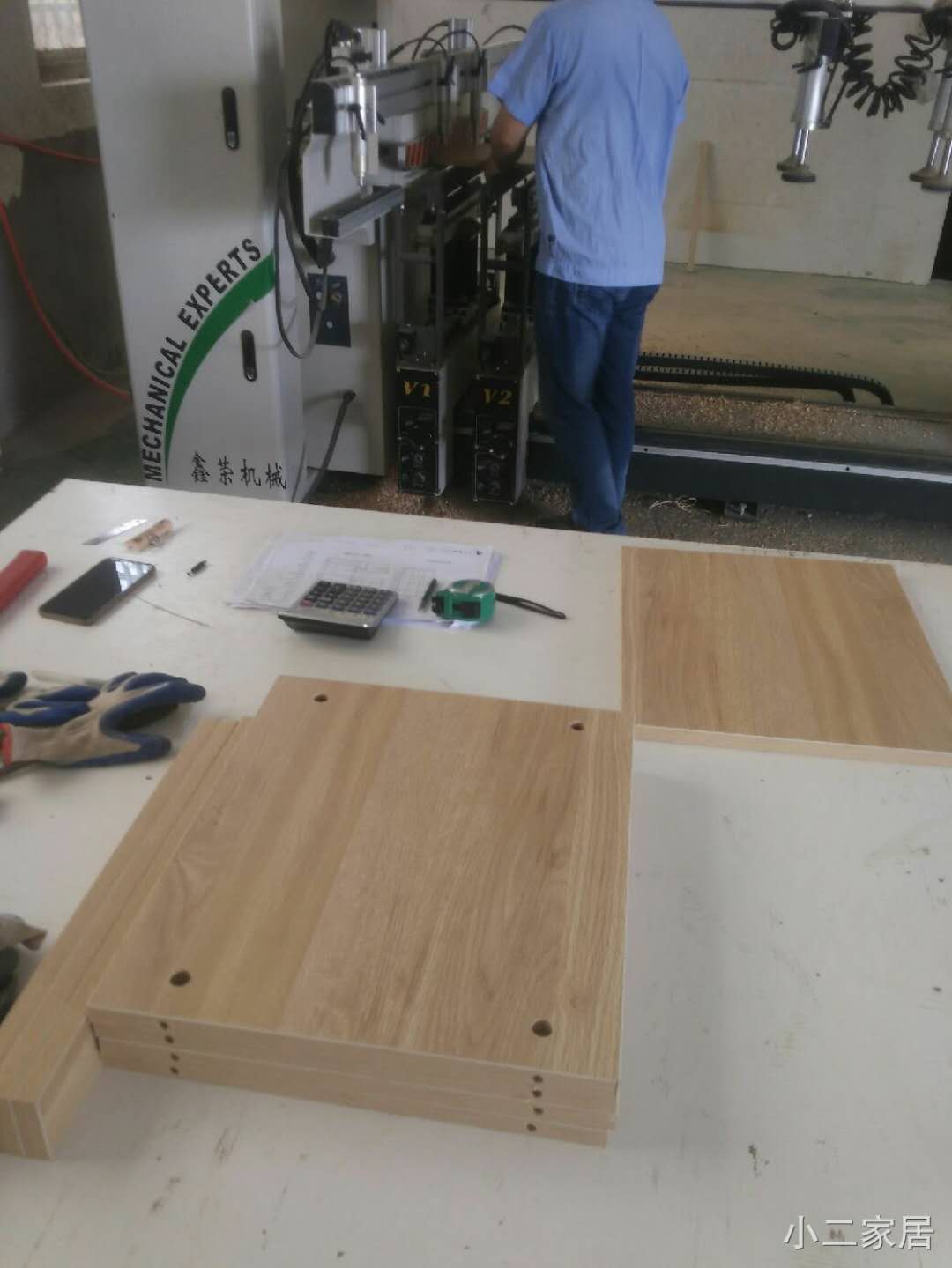 柜體板門板封邊打孔中,封邊條上有小二家居的logo!