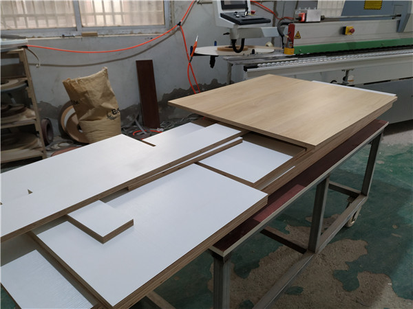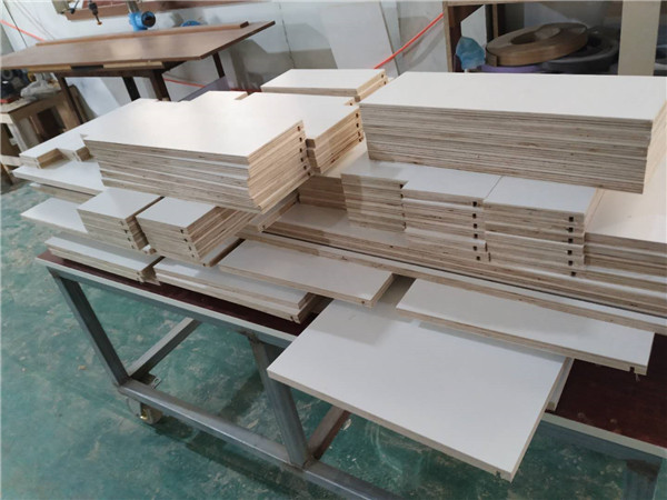 柜體側(cè)板和底板已經(jīng)封好邊打好孔啦,圖2是抽屜抽面的板材在封邊中,柜體板材都使用平安樹暖白色實木多層板制作。