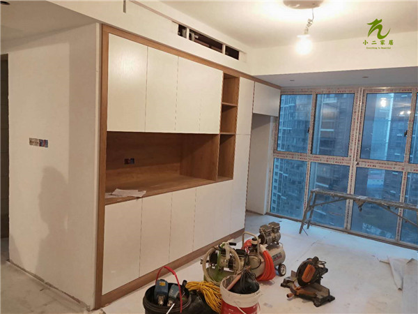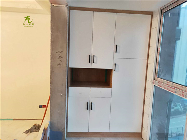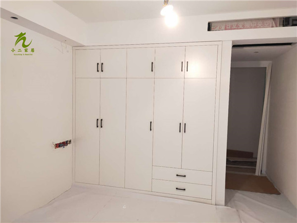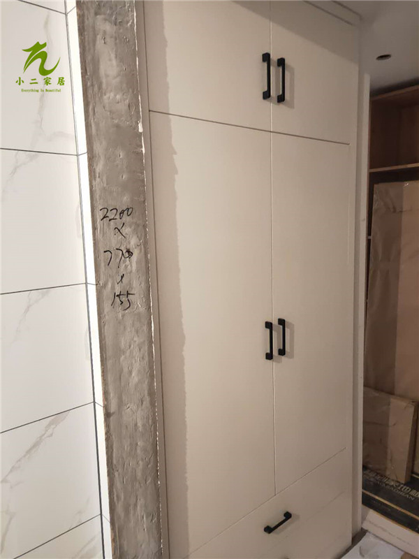 衣柜,衣帽間,餐邊柜和陽臺吊柜的柜體板材已經(jīng)封好邊,打好孔啦,封邊條上印有小二家居的logo。