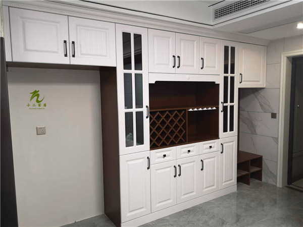 榻榻米板材使用平安樹富貴灰橡色實(shí)木多層板制作,酒柜板材使用平安樹小花胡桃色實(shí)木多層板制作。