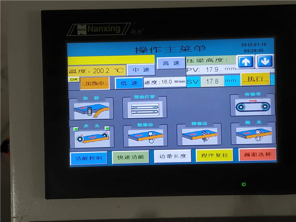 封邊使用專門的機器封邊哦,機器溫度到達200℃就可以封邊啦,現(xiàn)在在預(yù)熱中,封邊使用進口法國波士熱熔顆粒膠,封邊條上印有小二家居的logo。
