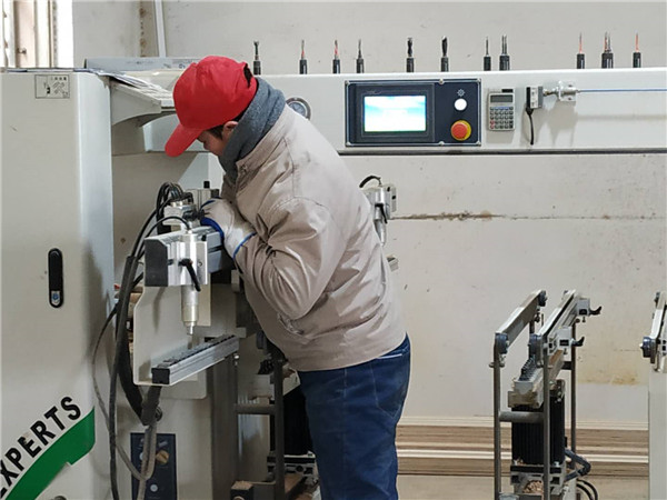 待封邊的柜體板材,大概今天下午就能封邊了,正在打孔的是主臥衣柜的板材,打孔使用專門的機器打孔,打出來的孔圓潤不爆邊,