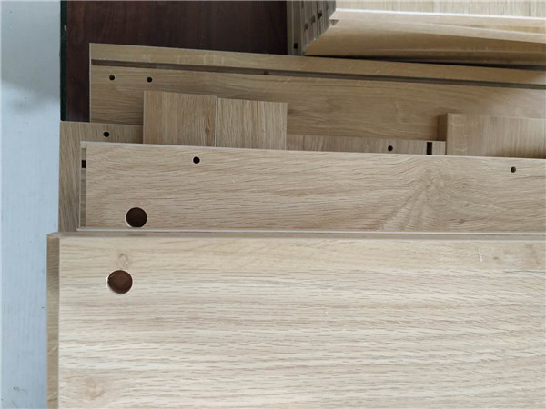 圖6是柜子的門板板材,打的大圓孔是用來裝鉸鏈的,板材使用平安樹金沙榆色實木多層板制作,