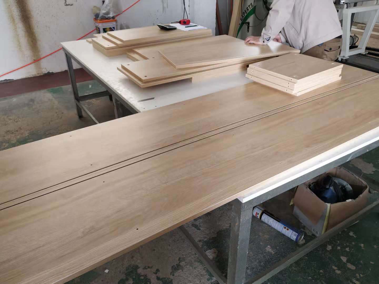 開始制作啦,主臥飄窗和北房間小柜的板材已經(jīng)封好邊打好孔了。