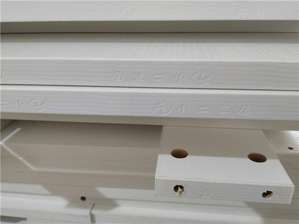 板材使用平安樹暖白色實木多層板制作,板材印有平安樹高級藍光防偽,封邊條上印有小二家居的logo。