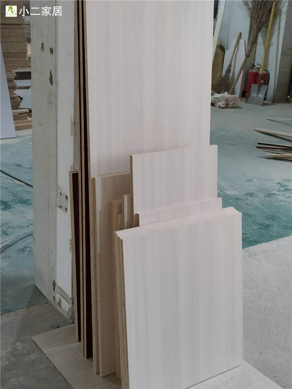 另一種顏色的板材是平安樹銀沙榆色實木多層板,用來制作櫥柜板,板材裁板中。