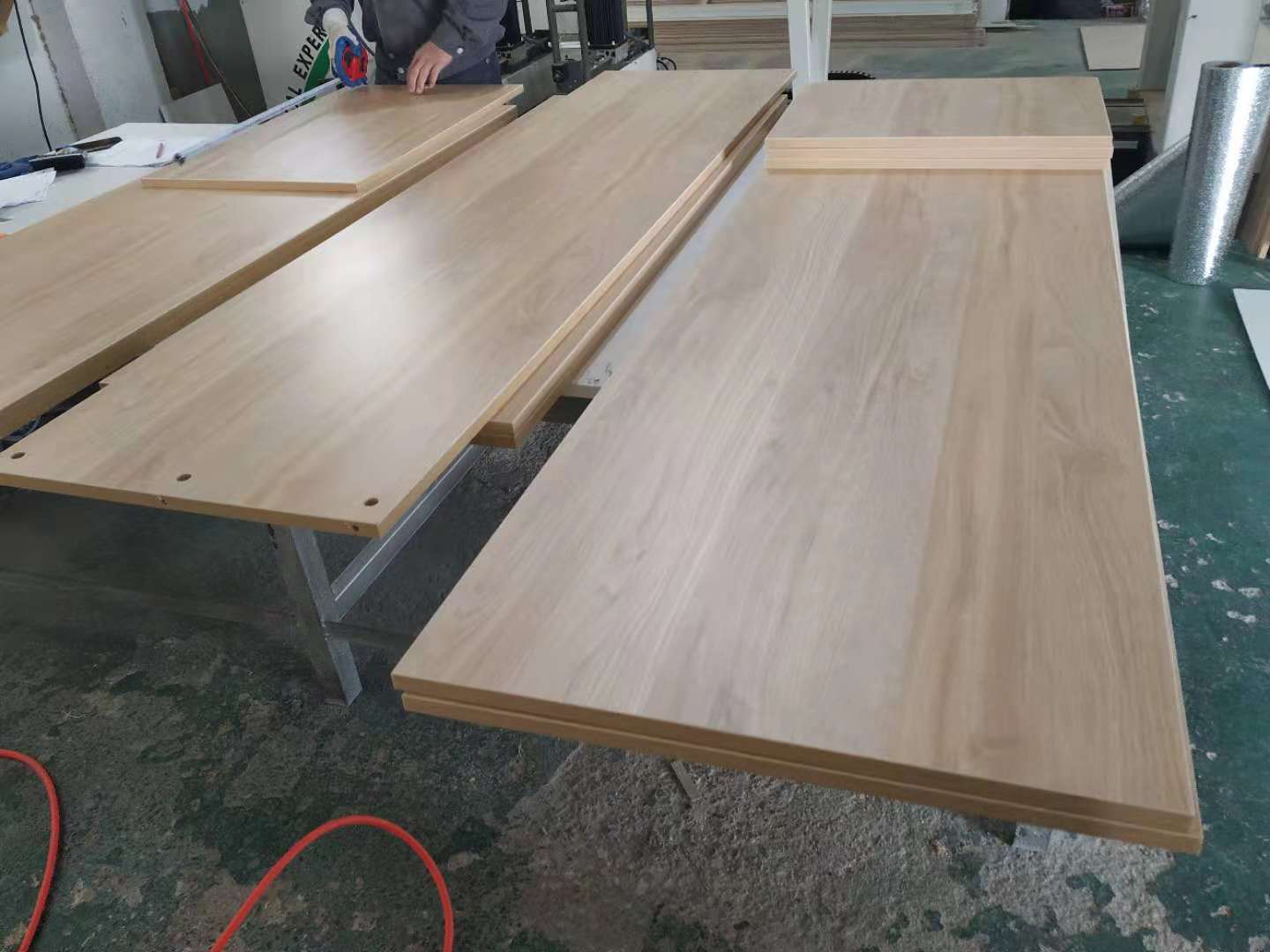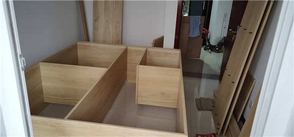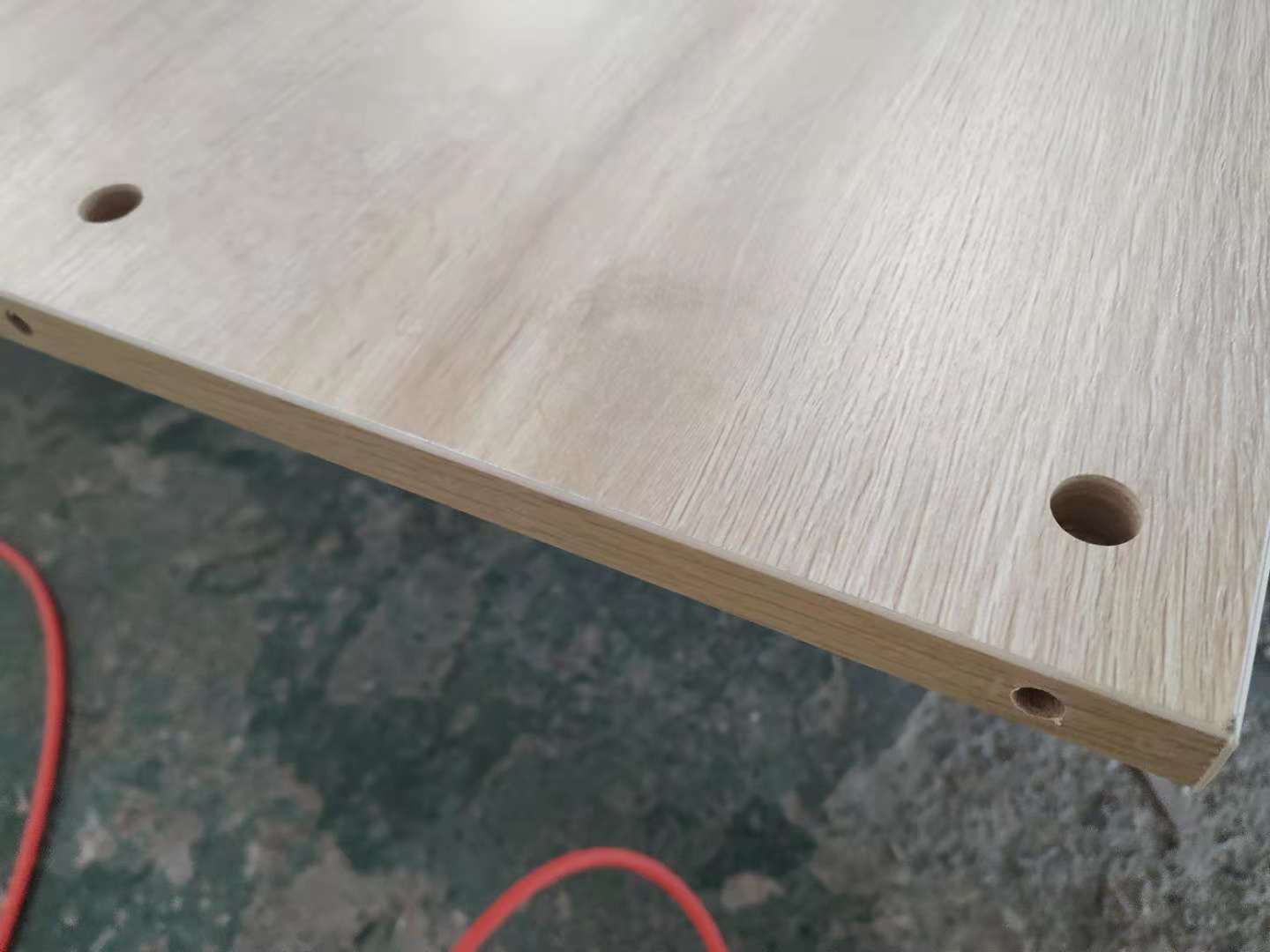 開始制作啦,廚房吊柜板制作打孔中,板材使用平安樹清水橡木色實(shí)木多層板制作。