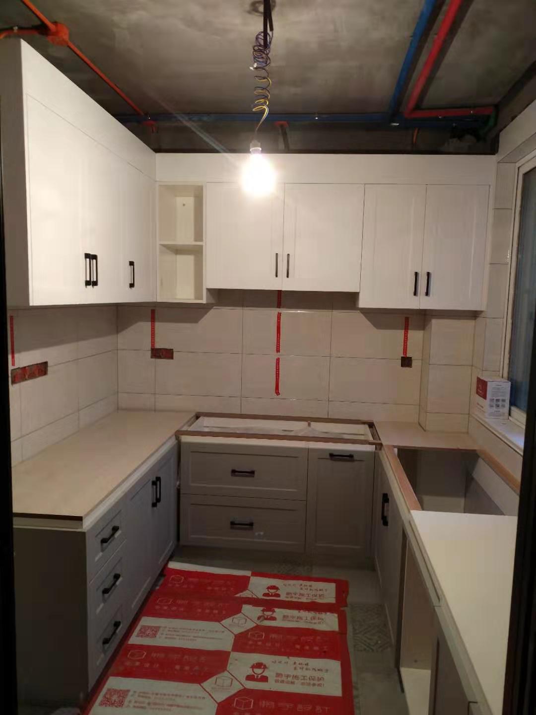 安裝進(jìn)行中,五金標(biāo)配:pvc雙層踢腳線、ABS尼龍柜腳、和居拉手,海蒂詩(shī)導(dǎo)軌、諾米鉸鏈。不得不說(shuō)師傅挺給力的,大半天時(shí)間柜體裝的差不多了,點(diǎn)贊