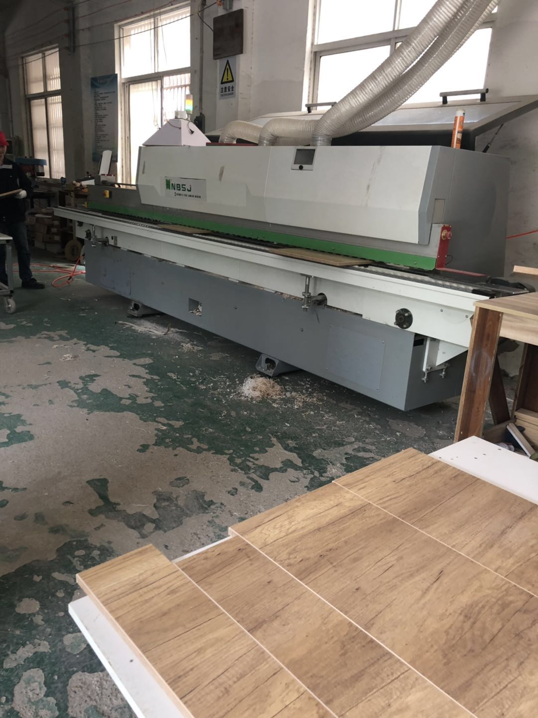 接下來封邊,使用法國波士熱熔顆粒較,設備封邊溫度達到200°C,封邊條上有小二家居的Logo哦,齒輪傳送帶可調節(jié),方便運輸大小不同的板材。