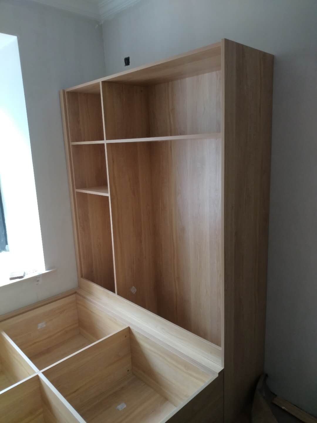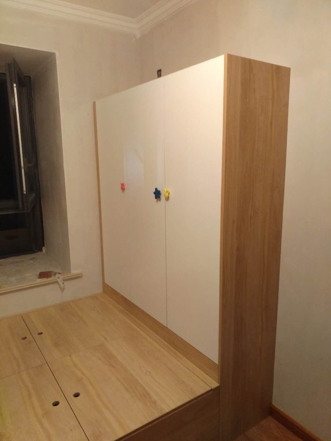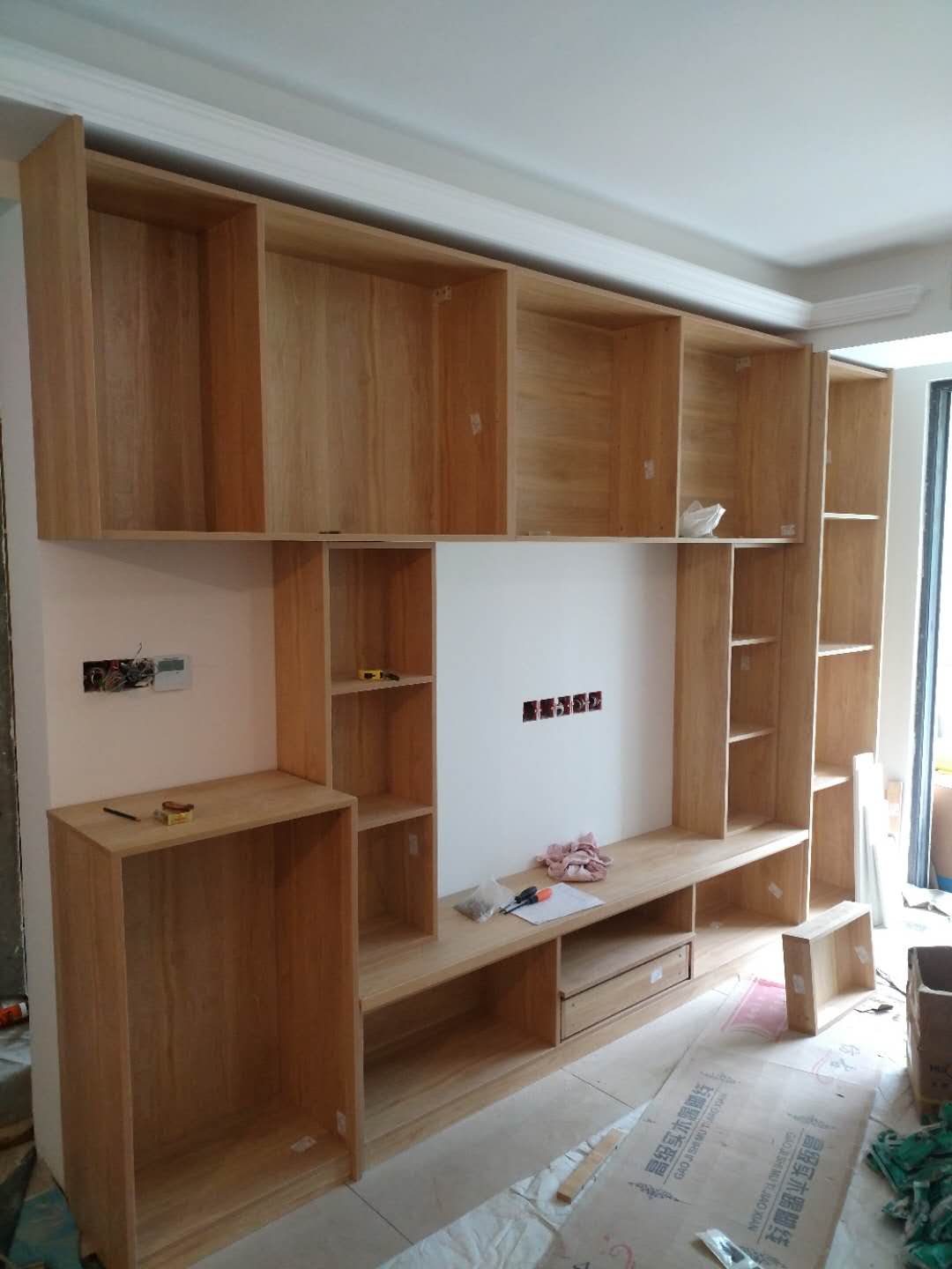 安裝中,不得不說師傅還是蠻給力的,原木色柜體已經(jīng)拼裝的差不多了,等柜門裝好在上一波整體效果。