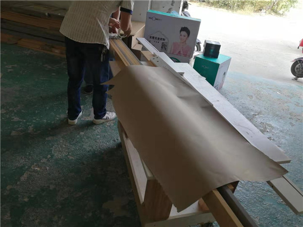 開始封邊啦!封邊采用法國波士熱熔顆粒膠,設(shè)備溫度達(dá)到190-200°C封出來的邊牢固,沒有爆邊,完美無瑕。每塊板上都貼有小標(biāo)簽,方便后期安裝師傅安裝