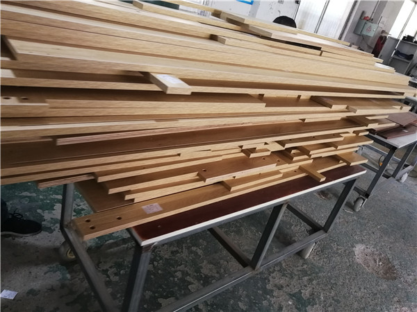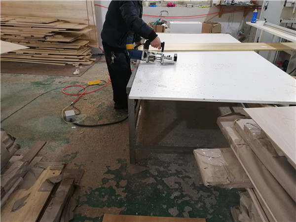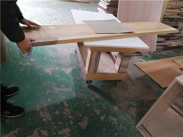 開始制作啦!柜體裁板中,板材使用平安樹實(shí)木多層板,清水橡木E0級制作,有高級的藍(lán)光防偽標(biāo)識哦