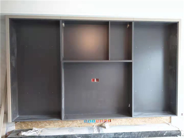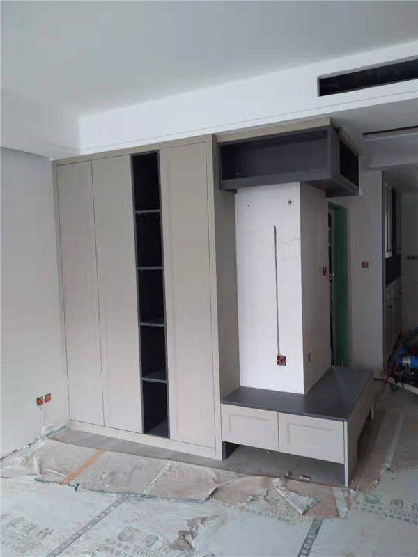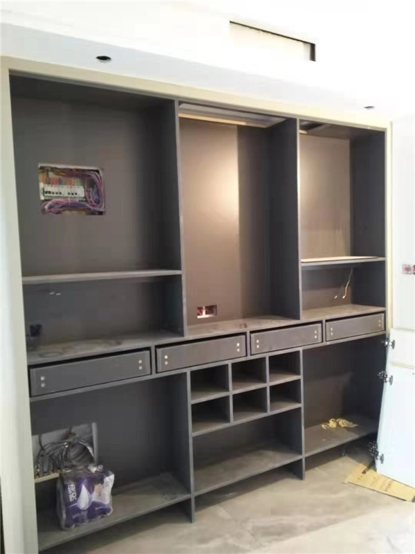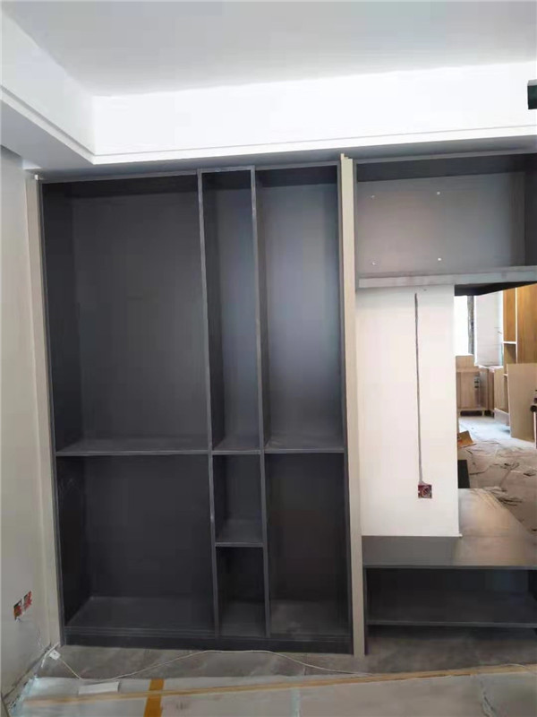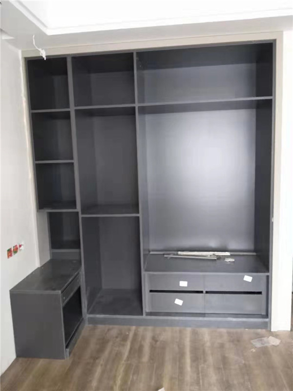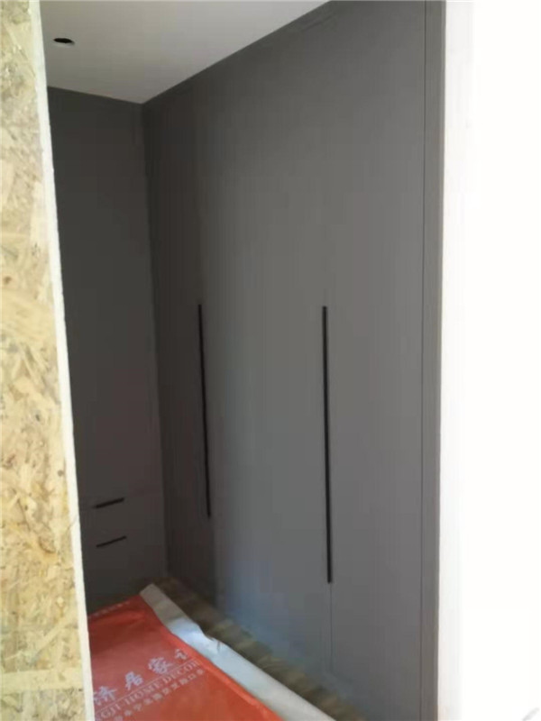 業(yè)主家的餐邊柜、鞋柜和兒童房衣柜都用了統(tǒng)一的平安樹鐵灰板制作,這么耐看的顏色后期效果肯定很棒!