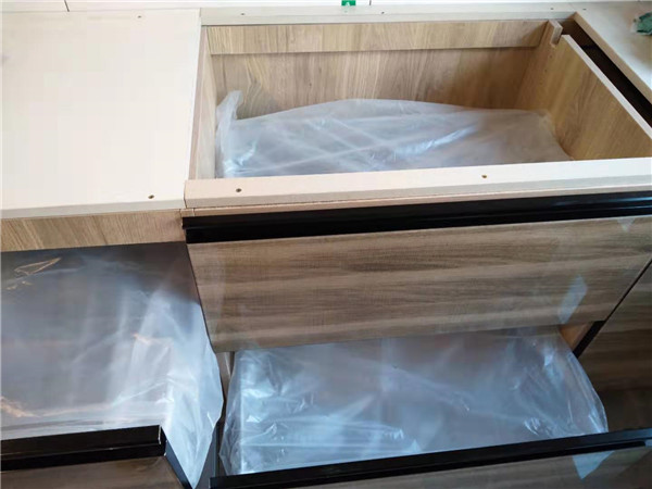 廚房還有部分收尾工作,后期還需要再去一趟業(yè)主家,拉籃也都用塑料膜保護(hù)起來了,防止灰塵進(jìn)入影響導(dǎo)軌的拉伸。