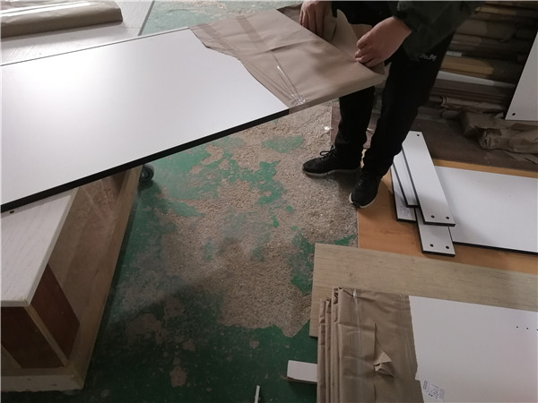 開始制作啦!柜體裁板中,板材使用平安樹實木多層板,霧麻暖白E0級制作,有高級的藍光防偽標識哦