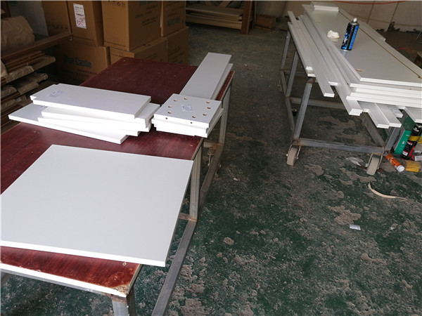 開始制作啦!柜體裁板中,板材使用平安樹實木多層板E0級制作,有高級的藍光防偽標識哦