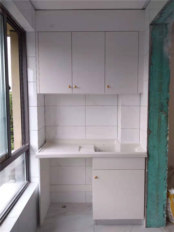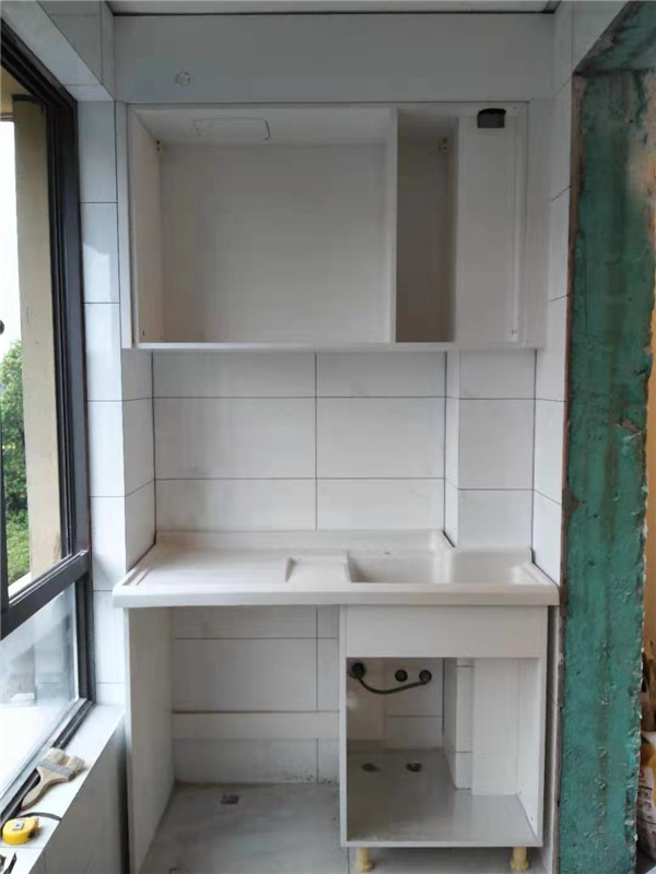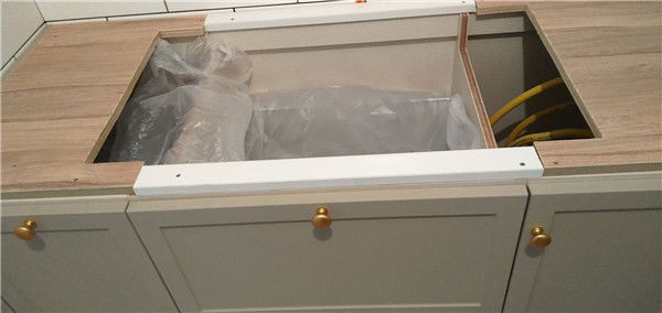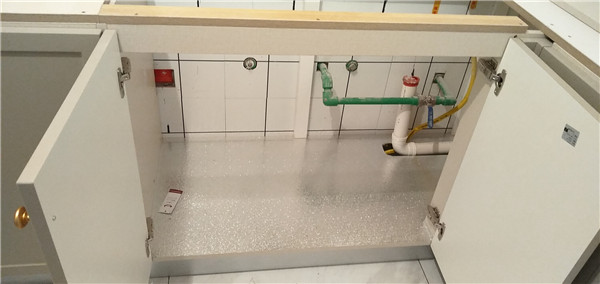 再來看看廚房部分,水槽都鋪有防水錫紙,拉籃也都用塑料膜保護起來了,防止灰塵進入影響導軌的拉伸。ABS尼龍柜腳和雙面踢腳線更耐用哦