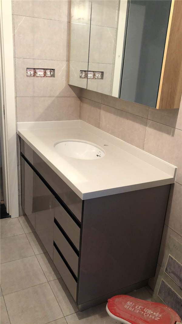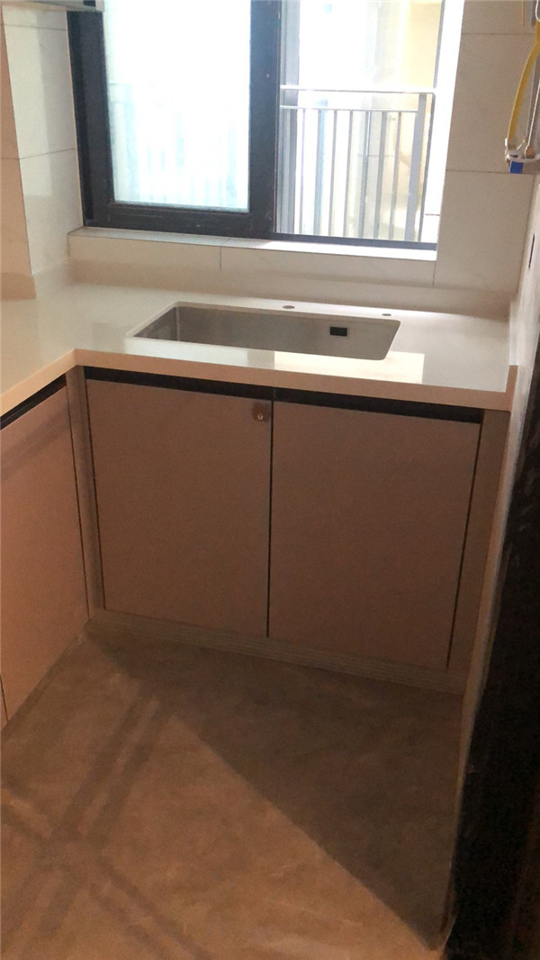 、灶具、浴柜臺(tái)盆放置在現(xiàn)場(chǎng),后期臺(tái)面安裝需用到。柜子安裝好后進(jìn)入臺(tái)面測(cè)量環(huán)節(jié),臺(tái)面量完后一個(gè)星期內(nèi)送貨并安裝。
