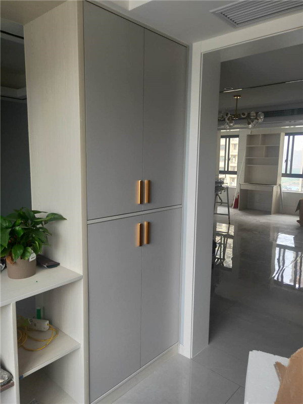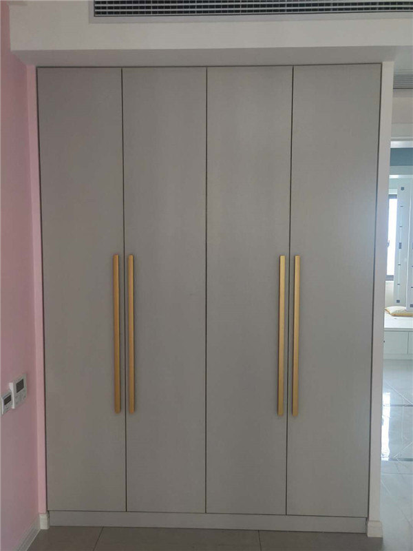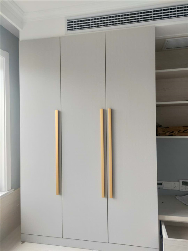 灰色門板配金色拉手這類型的組合較為搶眼,同時為整個房間的風(fēng)格注入一絲別樣的生機,更將現(xiàn)代衣柜原有的大氣以一種活波的形式表現(xiàn)出來了。注:柜體木工現(xiàn)場制作的,柜門定制