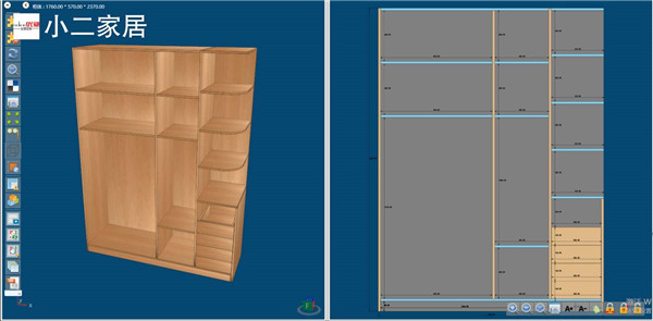 衣柜旁邊設(shè)計了開放式圓弧層板為整個衣柜增加了活波氣息,不顯得那么呆板,可以放包包,可愛的小擺件。防塵角活動孔塞也都安排上了,