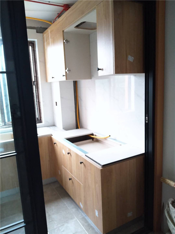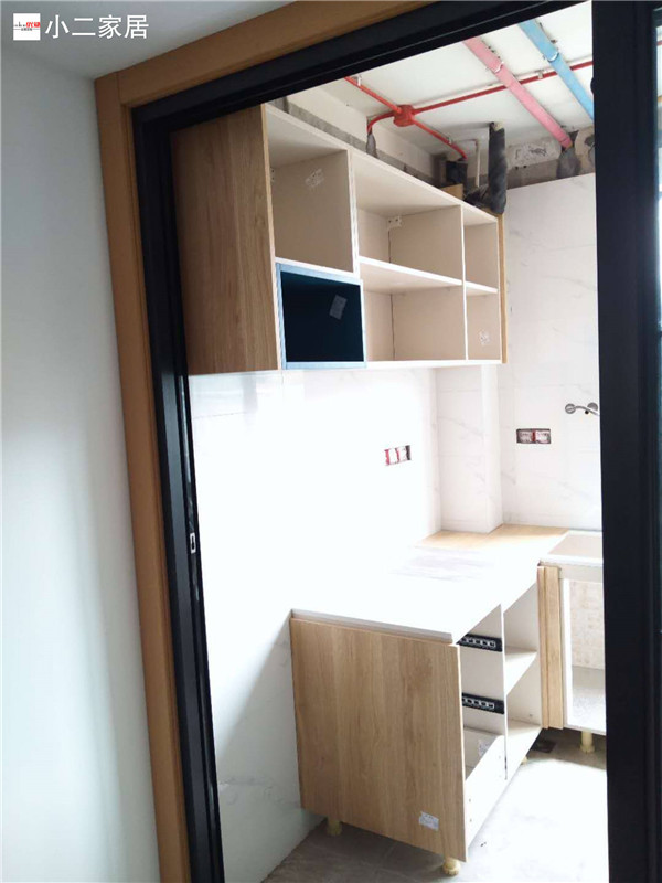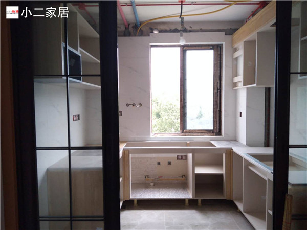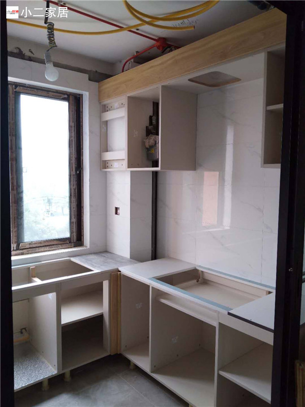 柜子基本拼裝好固定起來了,鞋柜連著卡座,既美觀又實用。業(yè)主家廚房采光挺好的,