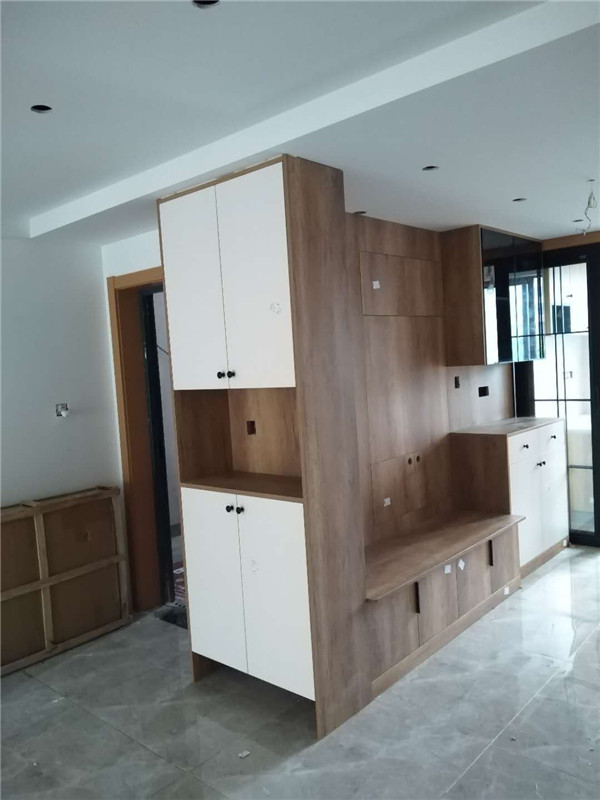 是餐邊柜的設(shè)計,餐邊柜和鞋柜采用的是轉(zhuǎn)角設(shè)計,餐邊柜墻面有電箱,而且