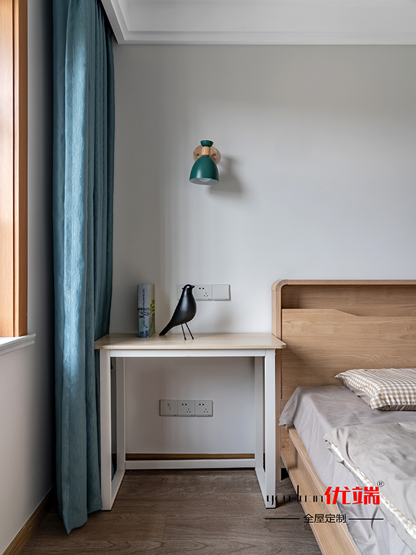 吊柜設(shè)計了一個藍色套盒,起到畫龍點睛的作用。衣柜柜體掛衣區(qū)折疊區(qū)劃分清晰,儲存空間足足的。
